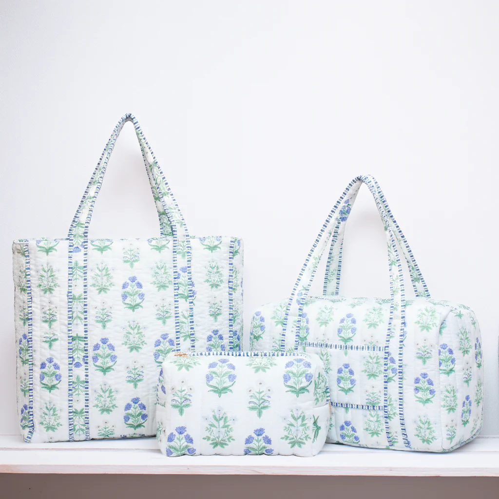 Personalized Quilted Blue Block Print Tote Bag - Embroidered Letters